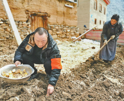 劉學(xué)燦(左)幫助農(nóng)牧民群眾種植土豆。宋豪新 攝