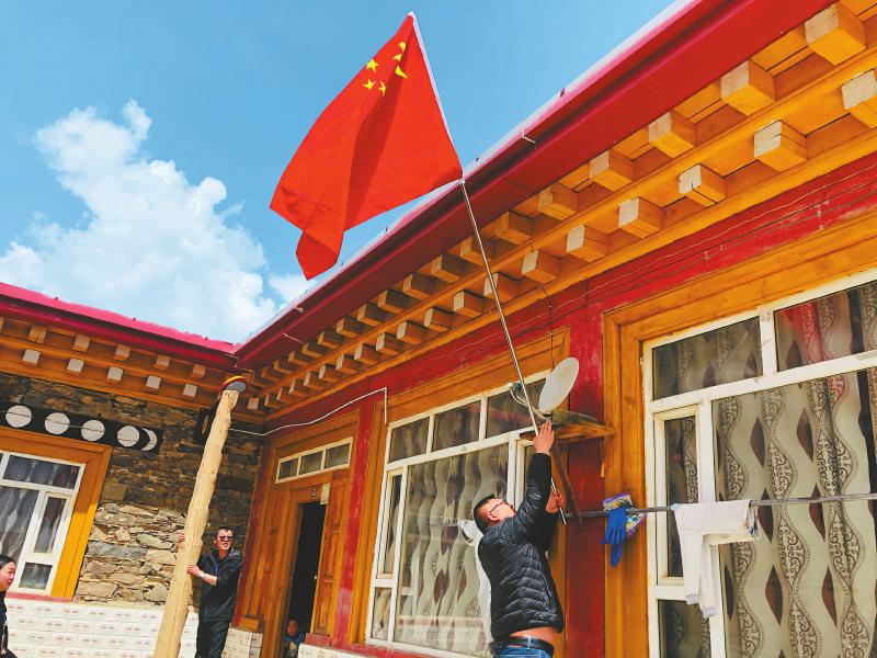 近日,阿壩州壤塘縣群眾在家門口插上國(guó)旗。壤塘縣委宣傳部供圖
