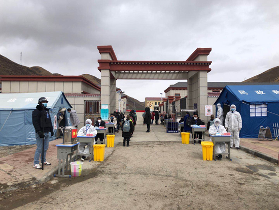 學(xué)校的防疫工作開(kāi)始了,食堂前架起了一個(gè)大水桶,給孩子們洗手用。老師們換上了從頭裹到腳的防護(hù)服,站在校門口。