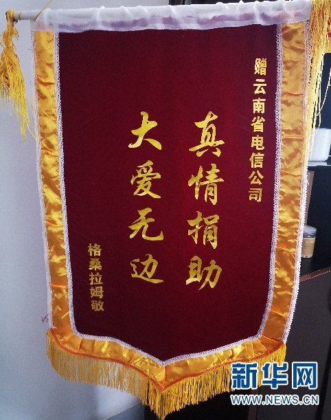 2019年9月,格桑拉姆將書有“真情捐助 大愛無邊”字樣的錦旗,送到前來燕門鄉(xiāng)調研的中國電信云南公司黨委書記、總經理王宏手上,以表達自己的感激之情。