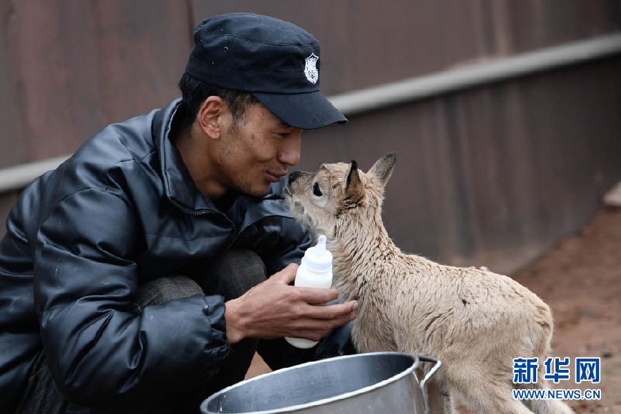 7月7日,三江源國家公園管理局長江源園區(qū)可可西里管理處卓乃湖保護(hù)站的工作人員才文多杰在給藏羚羊幼仔喂奶。新華社記者 薛玉斌攝