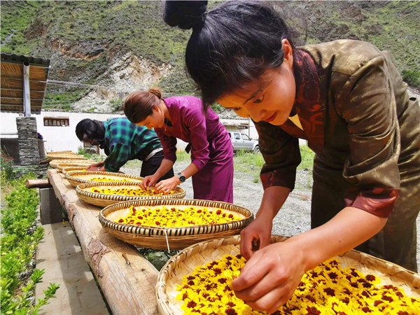 正在晾曬雪菊的村民們。(稻城縣委宣傳部供圖)