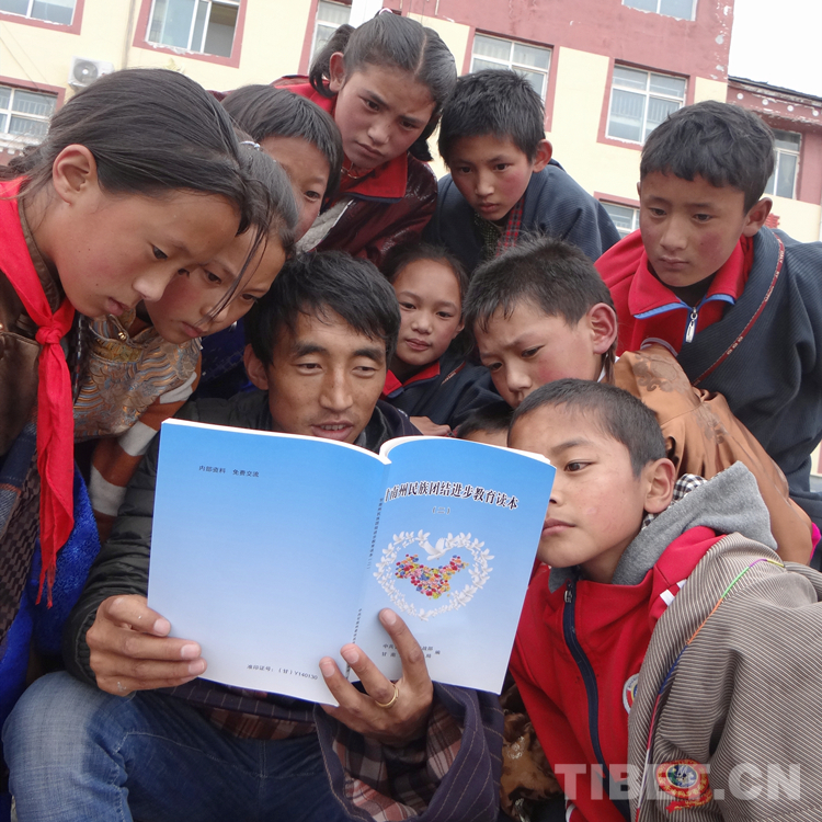 圖為甘南州瑪曲縣齊哈瑪鄉(xiāng)寄宿制學校的師生在學習《甘南州民族團結進步教育讀本》