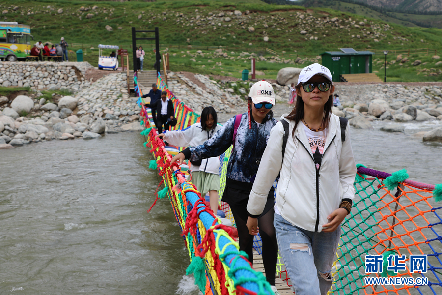 援鄂醫(yī)療隊(duì)員和家屬走過(guò)冰溝河景區(qū)“彩虹橋”。新華網(wǎng) 童張偉 攝