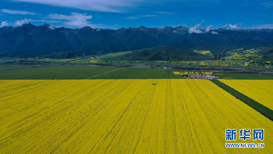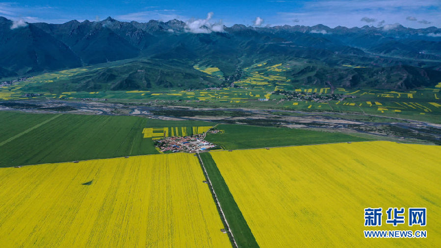 這是7月23日拍攝的門源回族自治縣境內(nèi)的油菜花(無人機(jī)照片)。新華社記者 吳剛 攝