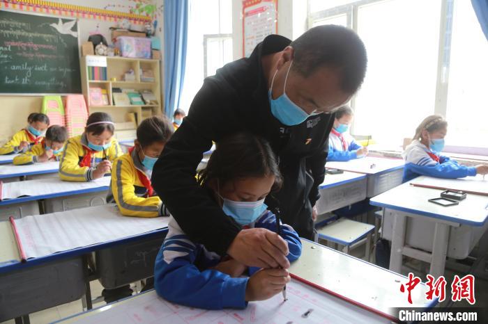 圖為鄉(xiāng)村學校少年宮的孩子們在老師的指導下練習書法。才讓本 攝