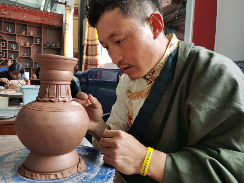 “我從小看著老藝人做黑陶,長大也成了黑陶手藝人。如今,不少人靠黑陶過上了好日子?!鼻嗪S駱洳刈遄灾沃菽抑t縣吉曲鄉(xiāng)山榮村古陶器傳承工程中心負責(zé)人才角仁增說。