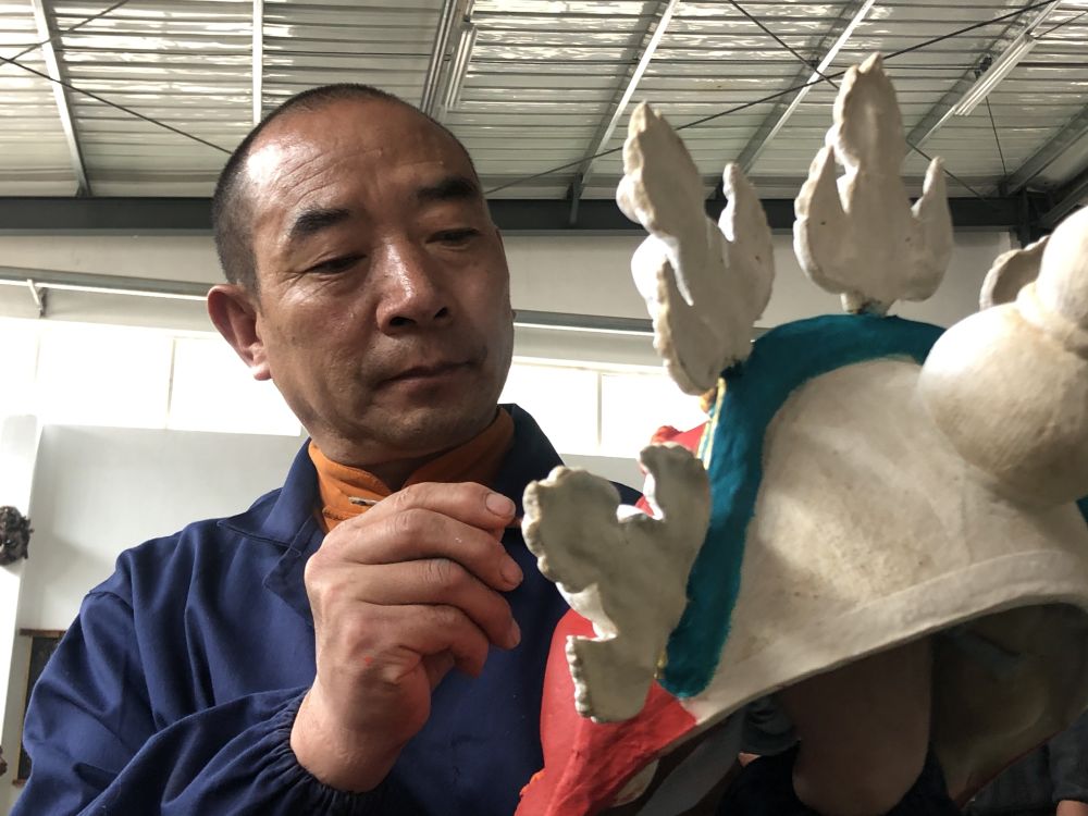 青海玉樹藏族自治州囊謙縣扶貧產(chǎn)業(yè)園內(nèi),手工藝人在制作傳統(tǒng)面具(7月4日手機拍攝)。新華社記者 李占軼 攝