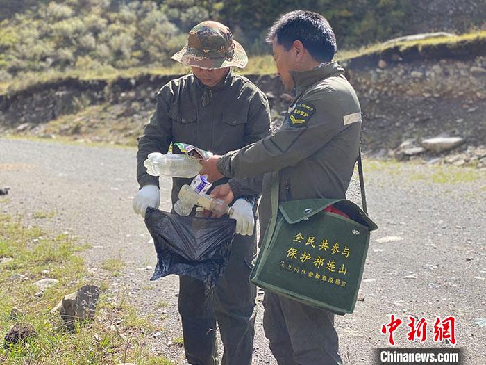 圖為9月9日,生態(tài)管護員王學清(右)在巡護過程中撿拾垃圾。 中新社記者 李江寧 攝