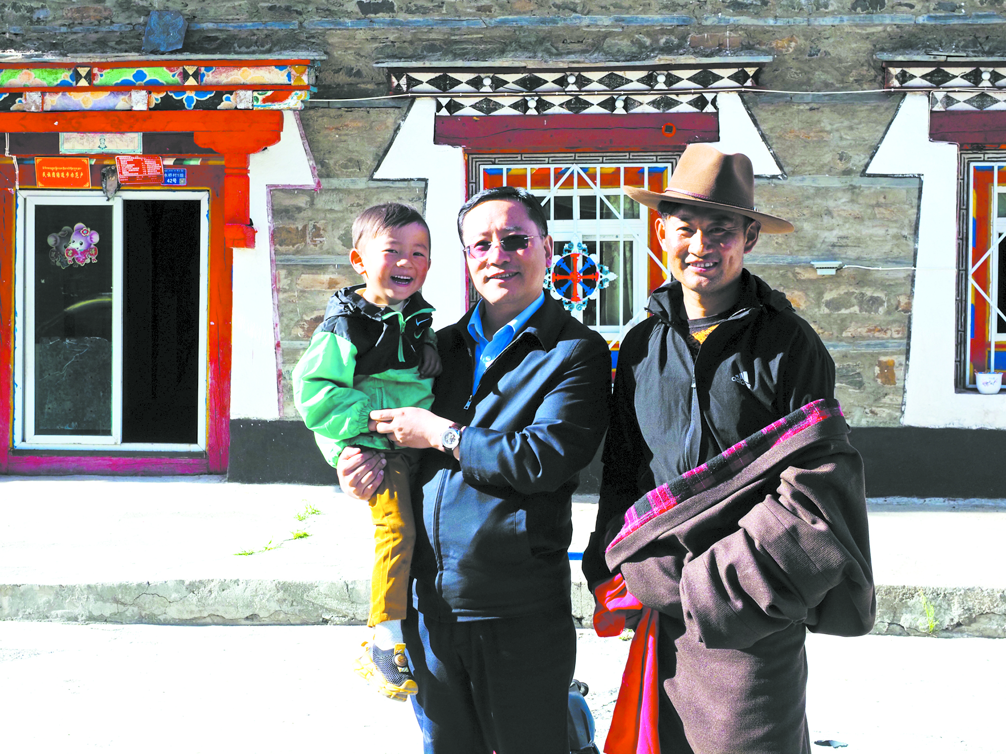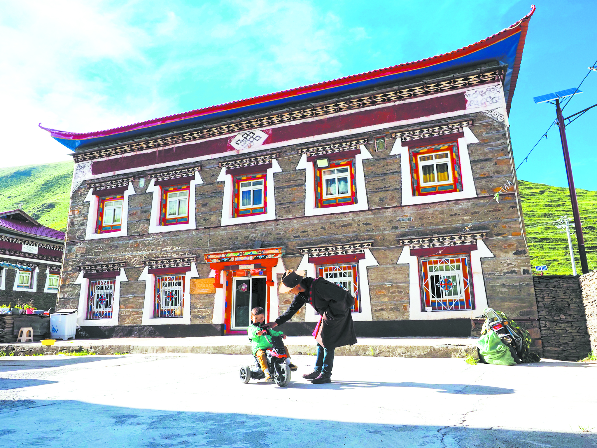 丁真汪秋陪兒子在自家改造的民居前玩耍。于譚陽(yáng) 攝