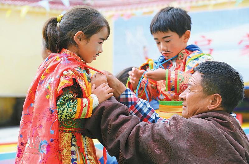 壤塘非遺傳承人為巴生村幼兒園學(xué)生穿上藏戲服裝,準(zhǔn)備表演藏戲《賽馬稱王》。易西 攝