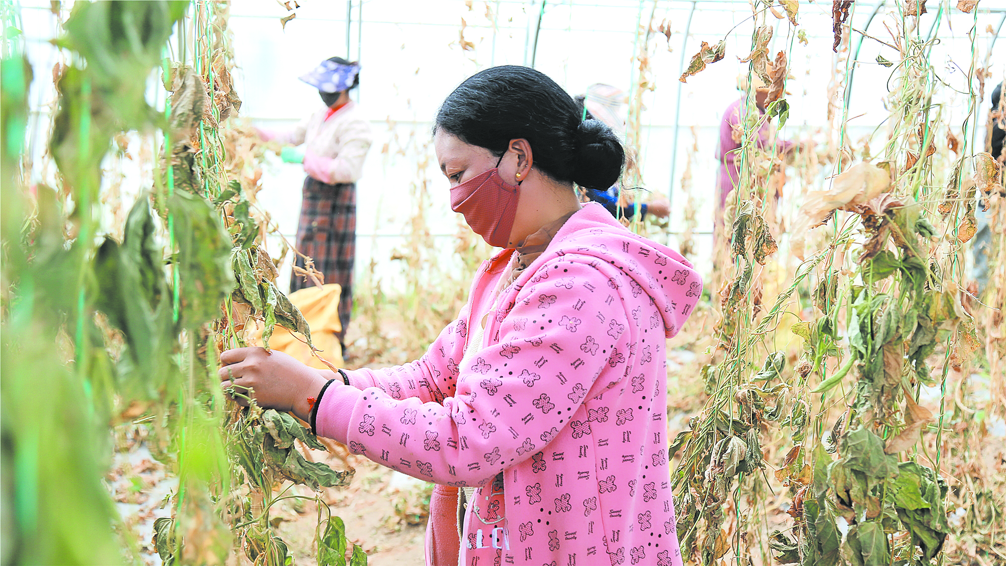 正是收獲時(shí)節(jié),在種植無(wú)筋豆種的大棚里,根窮卓瑪和其他村民正把成熟后已經(jīng)枯黃的無(wú)筋豆莢從藤上摘下來(lái)。