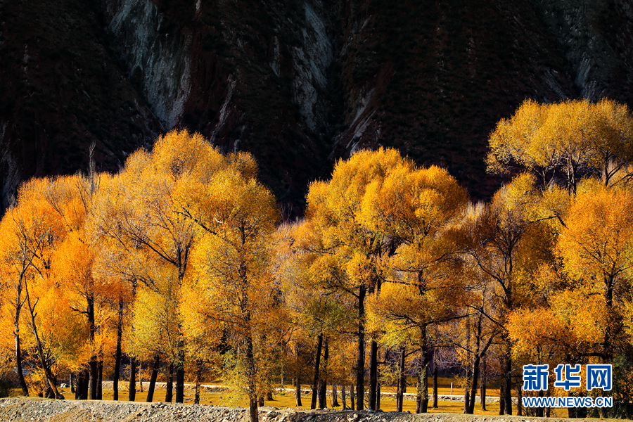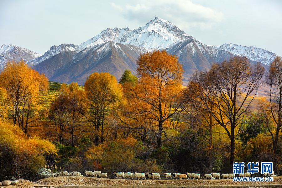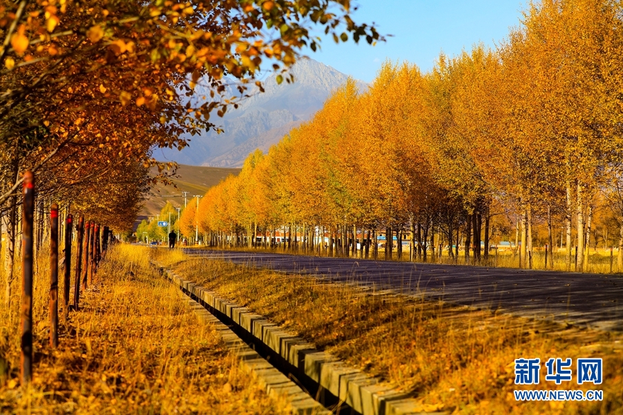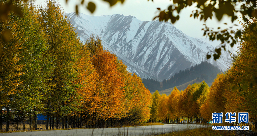 金黃色的樹(shù)木與遠(yuǎn)山交相輝映,處處呈現(xiàn)出醉人的美景。新華網(wǎng) 蘇金元 攝