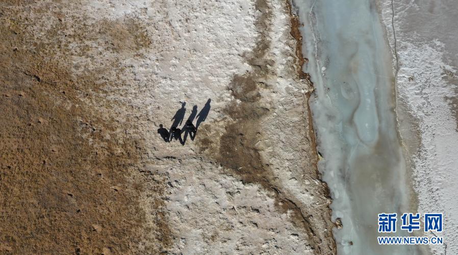 12月7日,站長趙新錄(中)與隊友鄧海平(左)、達才在可可西里索南達杰保護站管護區(qū)域內巡查(無人機照片)。新華社記者 王艷 攝