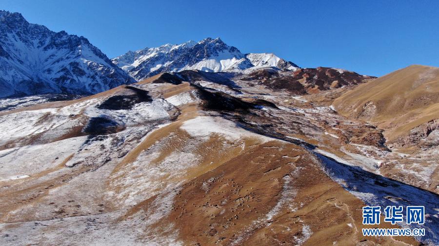 在青海省祁連縣,羊群在雪山下的草原上活動(dòng)(12月8日攝,無人機(jī)照片)。新華社記者 張宏祥 攝