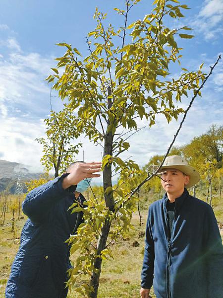 爐霍縣林草局技術(shù)人員檢查杏樹病蟲害情況。(爐霍縣林草局供圖)
