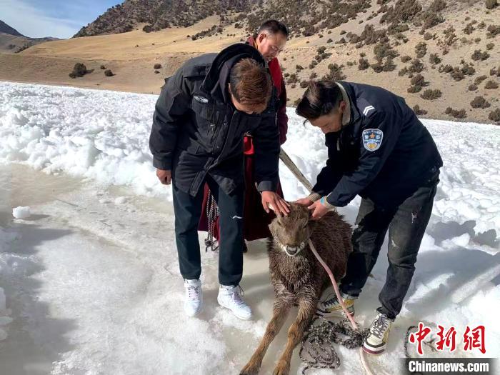 圖為生態(tài)保護(hù)人員營救出一只白唇鹿。長(zhǎng)江源園區(qū)曲麻萊管理處 供圖