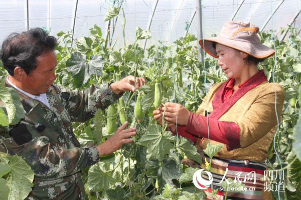 “你們要把瓜葉分叉中長出的小瓜叉去掉,這樣就能減少瓜養(yǎng)分的消耗,長出的西瓜才能又大又甜。”一位山東漢子在蔬菜大棚里向當(dāng)?shù)氐霓r(nóng)牧民傳授種植西瓜的心得。2016年10月,理塘縣引進(jìn)瑪吉阿米農(nóng)業(yè)開發(fā)有限公司,修建58個(gè)現(xiàn)代化標(biāo)準(zhǔn)大棚,并從山東引進(jìn)了溫帶瓜果蔬菜的現(xiàn)代化種植技術(shù)。