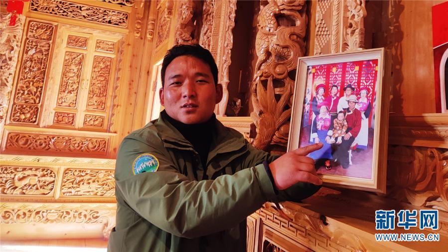 益西在向朋友展示全家福。新華社記者 嚴勇 攝
