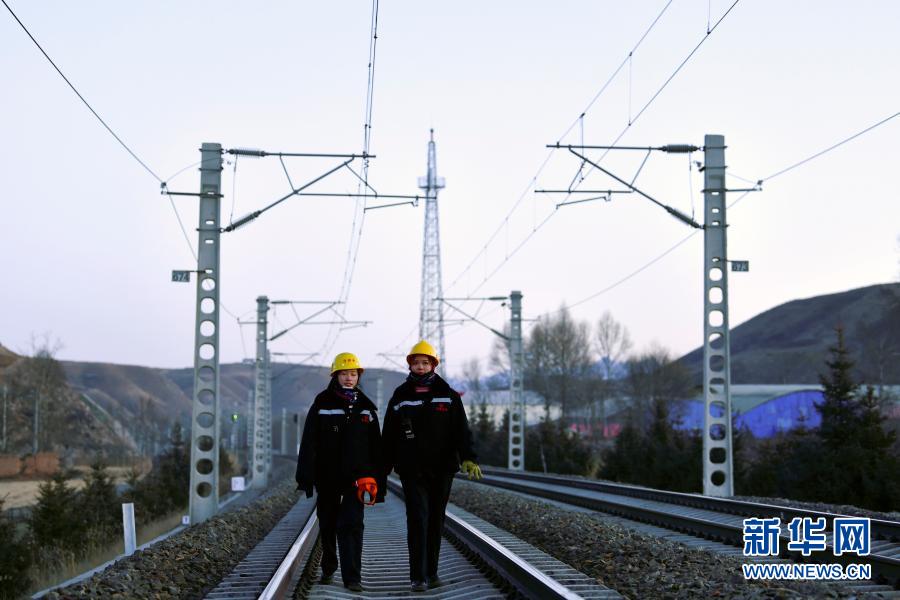 2月2日,在青藏鐵路公司西寧供電段哈爾蓋工區(qū)負責鐵路線上,郭勝強(左)與羅露露在巡檢接觸網(wǎng)。新華社記者 張龍 攝