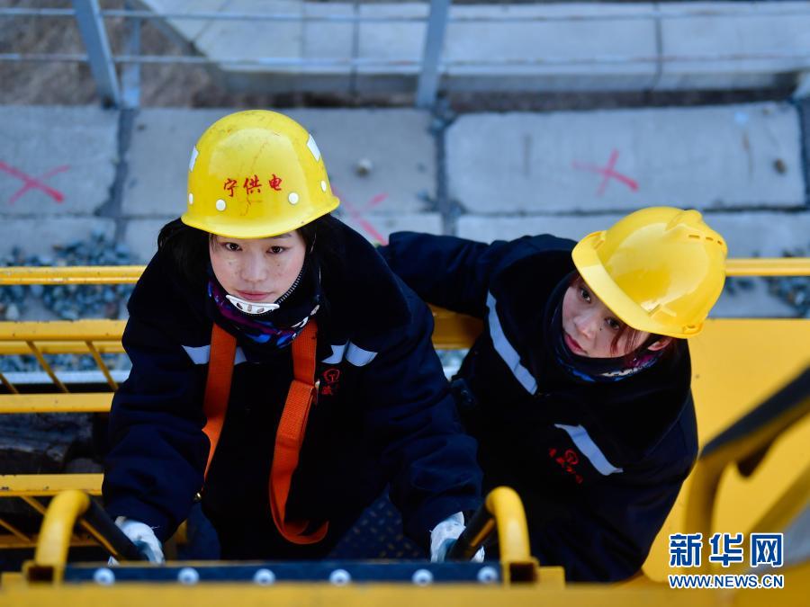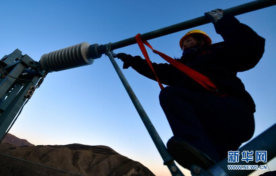 2月2日,在青藏鐵路公司西寧供電段哈爾蓋工區(qū)負責鐵路線上,羅露露在攀登接觸網(wǎng)支柱。新華社記者 張龍 攝
