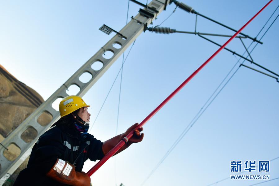 2月2日,在青藏鐵路公司西寧供電段哈爾蓋工區(qū)負責鐵路線上,羅露露在檢修螺絲。新華社記者 張龍 攝