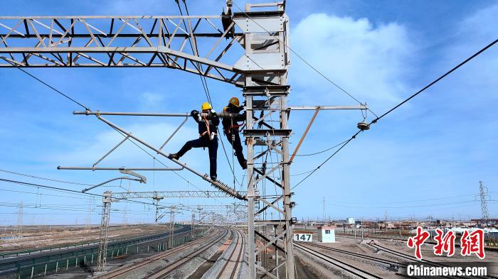圖為10米高的鐵塔,“女蜘蛛俠”們一步一步爬了上去。攀爬、定位,綁好安全帶,拿起扳手、改錐熟練地檢修接觸網(wǎng)的各個(gè)部位,根本看不出來這兩個(gè)游走在鐵塔頂端的“蜘蛛俠”是兩個(gè)剛剛走出校園的女孩子。宗布爾 攝
