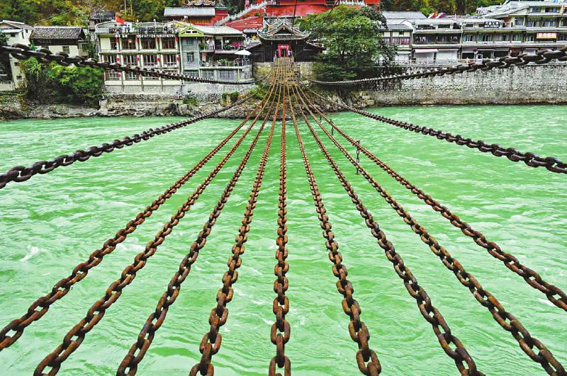瀘定橋始建于清康熙四十四年(1705年),是大渡河上建造最早最長的一座橋梁,橋身由十三根鐵鏈組成,下邊九根作為底鏈,兩邊四根作為扶手,橋長101.67米,橋?qū)?米,由12164個(gè)鐵環(huán)組成,十三根鐵鏈重達(dá)21噸。