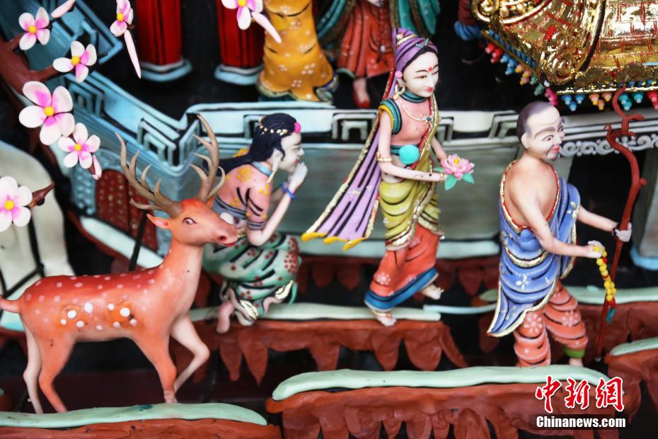 塔爾寺酥油花是中國國家級“非遺”項目,農歷正月十四,中新社記者獲準探訪塔爾寺酥油花制作基地——上、下花院。兩個花院分別用酥油花制作的亭臺樓閣、飛禽走獸躍然花架之上,兩尊一人多高的主佛,面龐白皙、神態(tài)安詳。