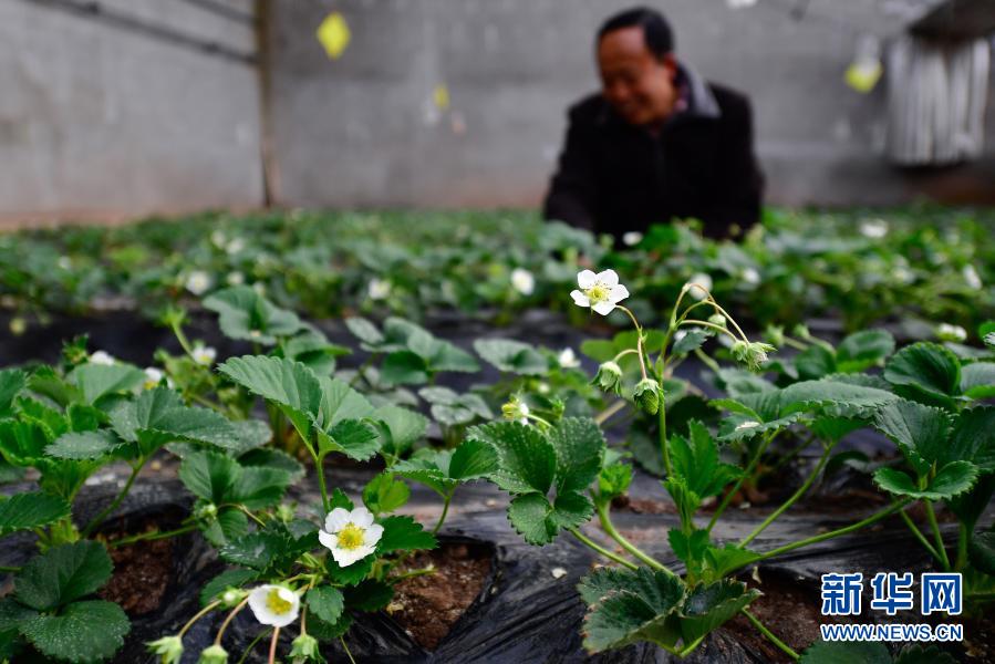 3月14日,在青海省果洛藏族自治州農(nóng)牧業(yè)生態(tài)科技示范園內(nèi),農(nóng)業(yè)技術(shù)員宋建東在查看草莓生長(zhǎng)情況。新華社記者 張龍 攝