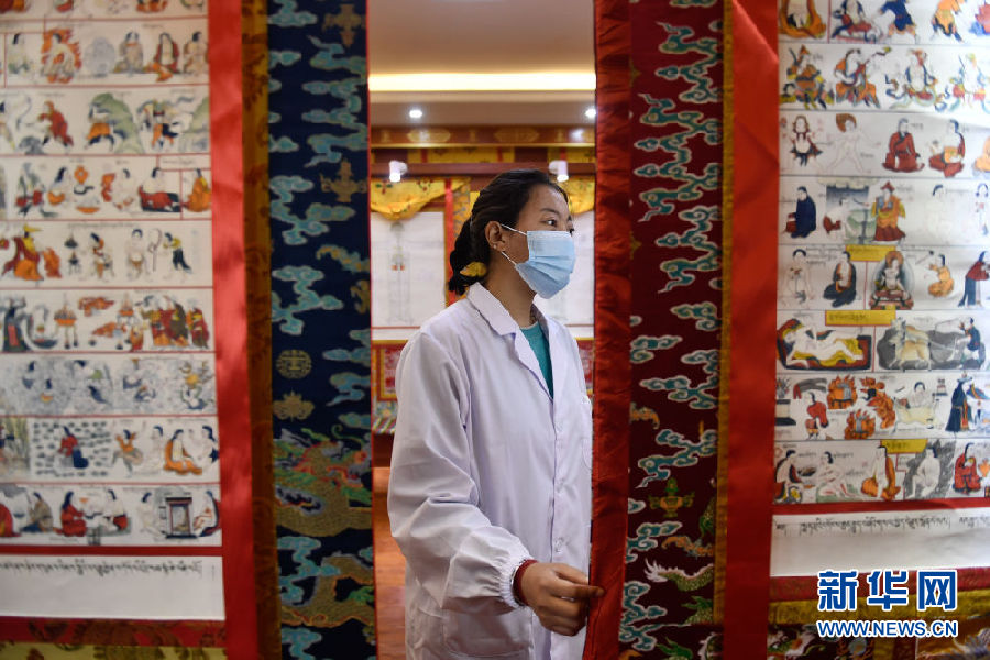 3月16日,在果洛藏族自治州職業(yè)技術(shù)學(xué)校,2020級(jí)藏醫(yī)醫(yī)療與藏藥專業(yè)學(xué)生才讓措通過(guò)藏醫(yī)典籍唐卡學(xué)習(xí)。新華社記者 張龍 攝