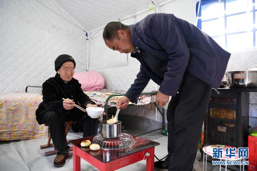 3月16日,在舟曲縣果耶鎮(zhèn)磨里村、果耶村滑坡災(zāi)害應(yīng)急避險(xiǎn)臨時(shí)安置點(diǎn),受災(zāi)群眾在帳篷內(nèi)吃飯。新華社記者 范培珅 攝