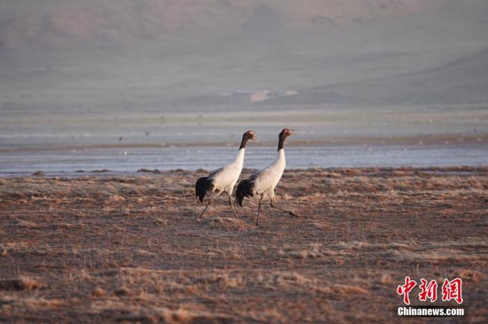 資料圖為黑頸鶴在青海湖邊散步。 中新社發(fā) 智華 供圖