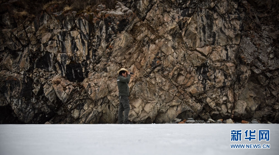 4月23日,祁連山國家公園沙龍灘管護站生態(tài)管護員羅藏次成在巡護途中使用望遠鏡監(jiān)測野生動物。新華社記者 吳剛 攝