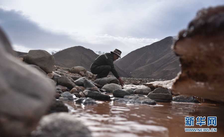 4月22日,祁連山國家公園油葫蘆管護站生態(tài)管護員普華才讓在巡護途中洗手。新華社記者 吳剛 攝
