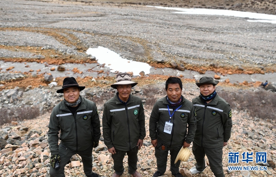 4月22日,祁連山國家公園油葫蘆管護站生態(tài)管護員德康、普華才讓、王學清、朱江云(從左至右)在巡護途中合影。新華社記者 張宏祥 攝
