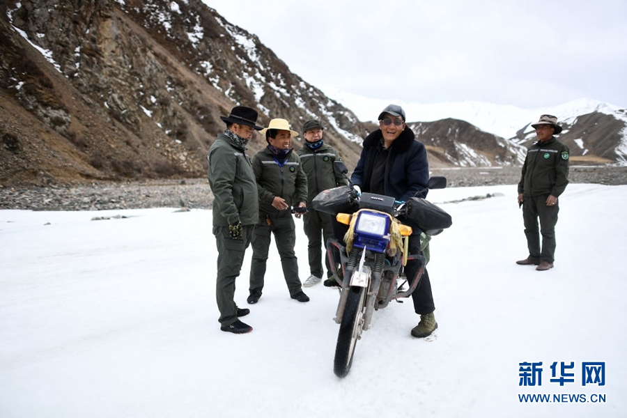 4月22日,祁連山國家公園油葫蘆管護站生態(tài)管護員在巡護途中與居住在此的牧民才布旦(前)交談。新華社記者 張宏祥 攝