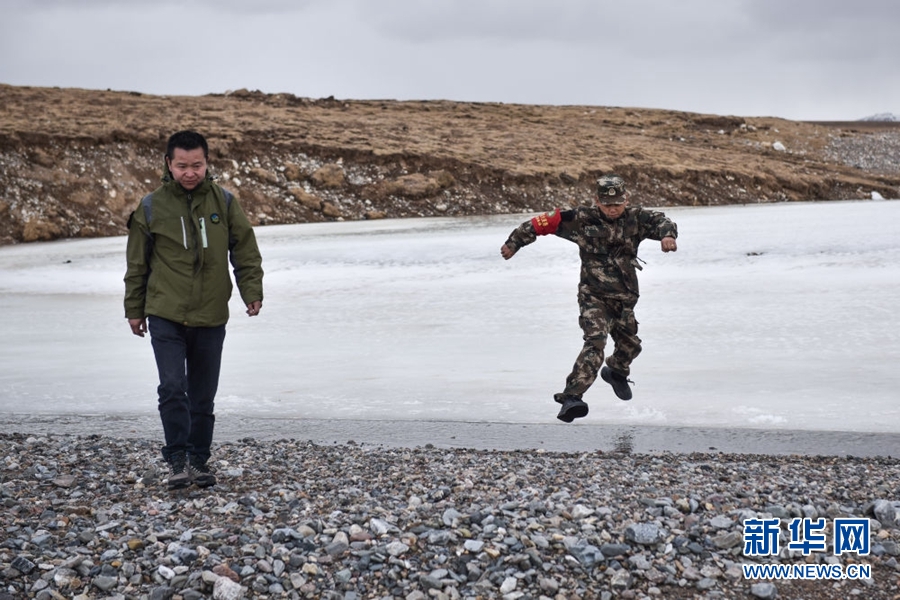 4月23日,祁連山國家公園沙龍灘管護站生態(tài)管護員羅藏次成(右)在巡護途中跳過水面。新華社記者 吳剛 攝