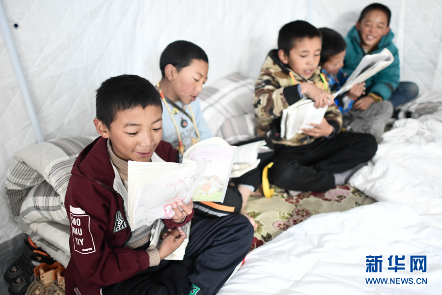 5月22日,在瑪多縣黃河鄉(xiāng)寄宿制學(xué)校救災(zāi)安置點(diǎn),孩子們?cè)谧x書(shū)。新華社記者 薛玉斌 攝
