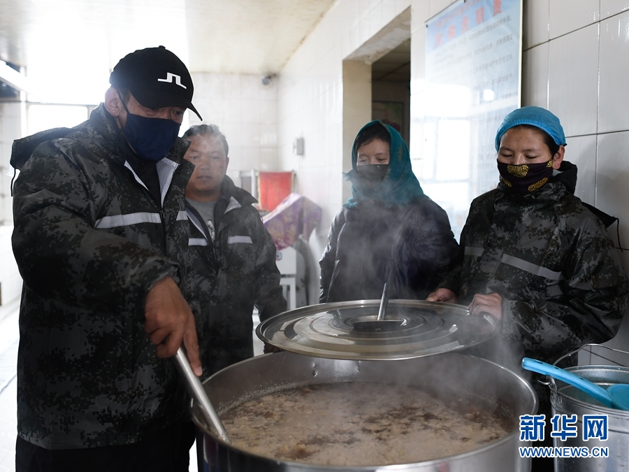 5月22日,在瑪多縣黃河鄉(xiāng)寄宿制學(xué)校救災(zāi)安置點(diǎn),老師們?cè)诮o學(xué)生制作肉粥。新華社記者 張龍 攝