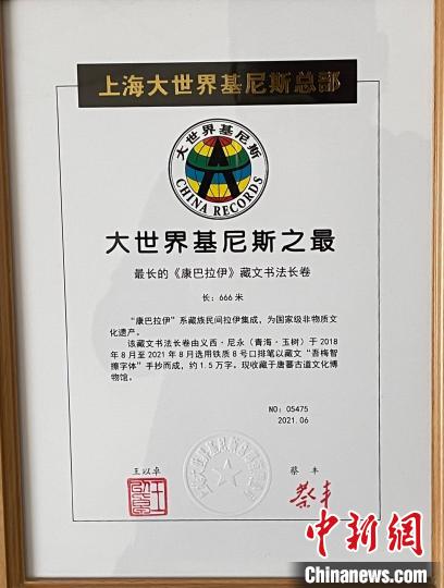 6月10日,青海省玉樹州治多縣唐蕃古道文化博物館發(fā)布信息稱,由該管收藏的國(guó)家級(jí)非物質(zhì)文化遺產(chǎn)——藏族民間文學(xué)手抄《康巴拉伊》最長(zhǎng)藏文書法長(zhǎng)卷,獲評(píng)“大世界基尼斯之最”(中國(guó)之最)。