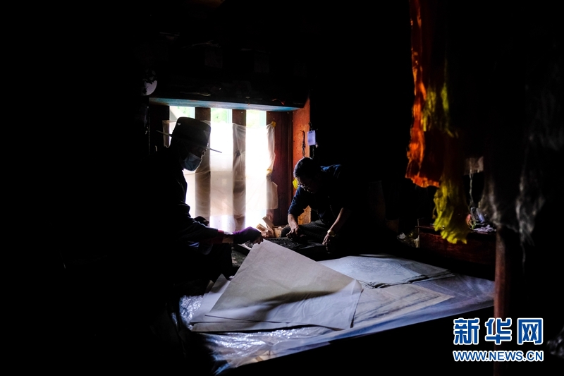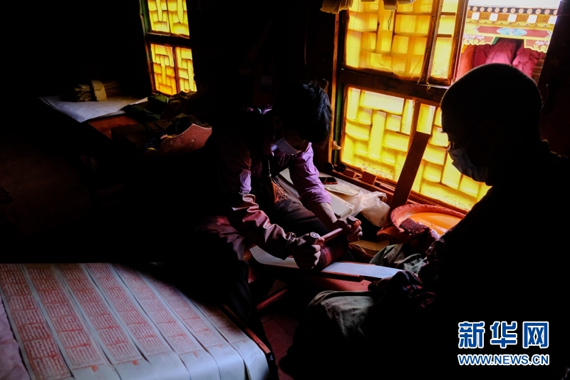 藏族雕版印刷非遺傳承人在校對木刻版。新華網 張可凡 攝