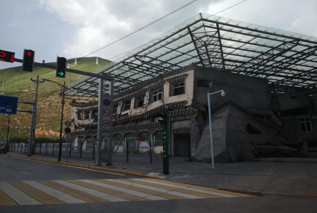 沿著214國道駛?cè)肭嗪J∮駱渲萦駱涫?,在第一個(gè)路口闖入眼簾的是一座在地震中損毀的房子——這就是3層樓高、擁有71間客房的格薩爾王賓館,它被保留下來作為對十年前那場災(zāi)難的紀(jì)念。
