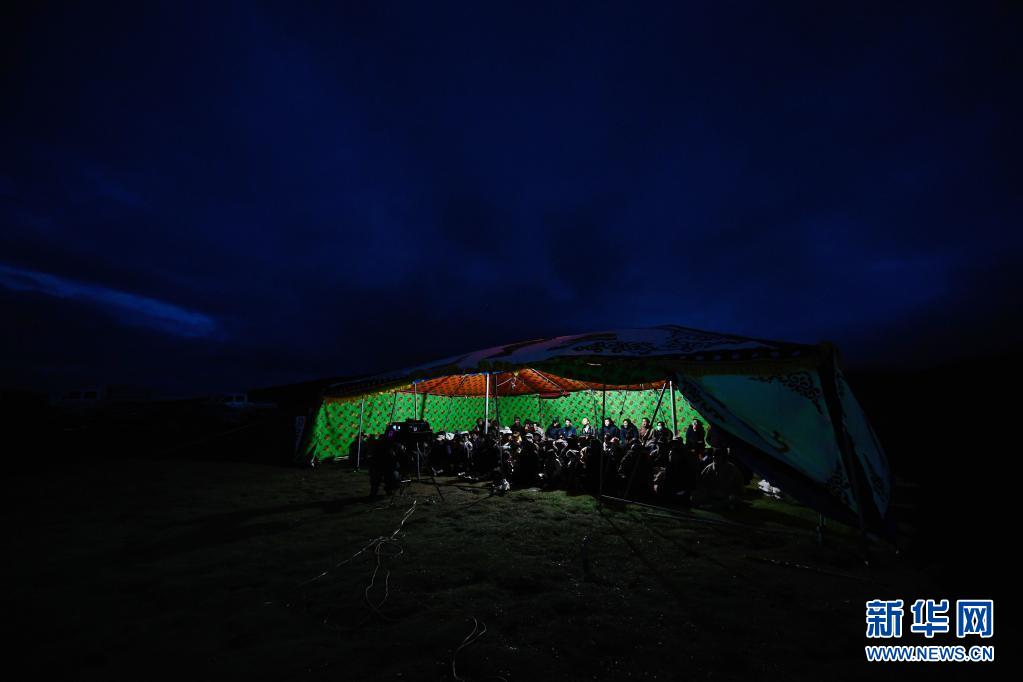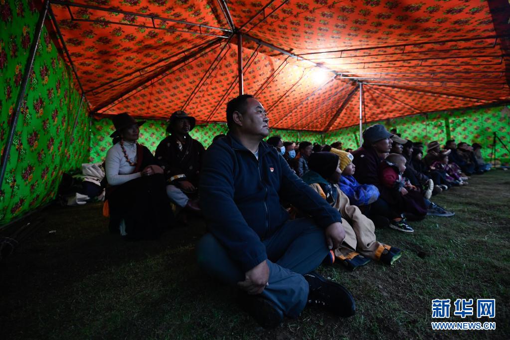 8月3日,在瑪沁縣當洛鄉(xiāng)貢龍村的夏季草場上,牧民群眾在看電影。新華社記者 張龍 攝