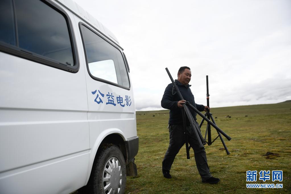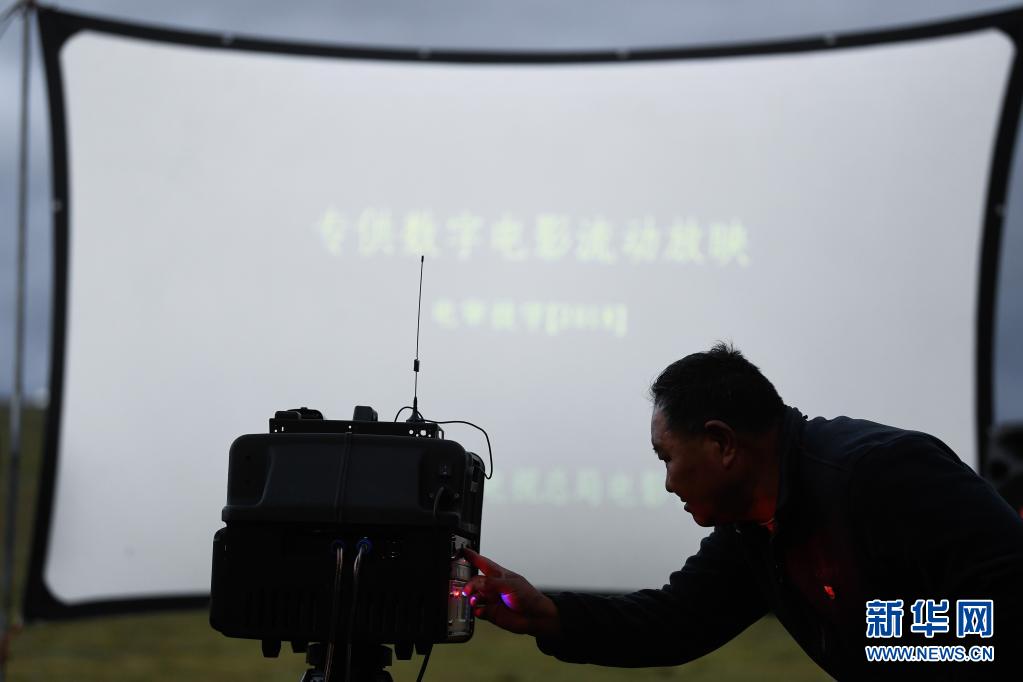 8月3日,在瑪沁縣當洛鄉(xiāng)貢龍村的夏季草場上,南拉才讓為牧民放電影。新華社記者 張龍 攝