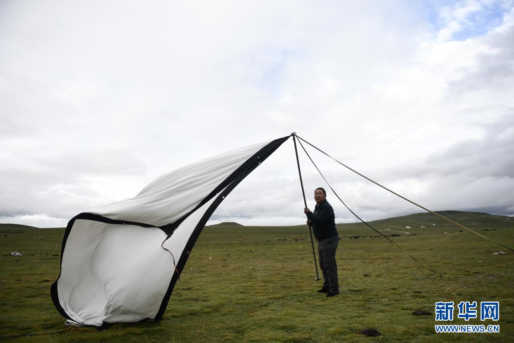 8月3日,在瑪沁縣當洛鄉(xiāng)貢龍村的夏季草場上,南拉才讓在搭設(shè)電影幕布。新華社記者 李占軼 攝