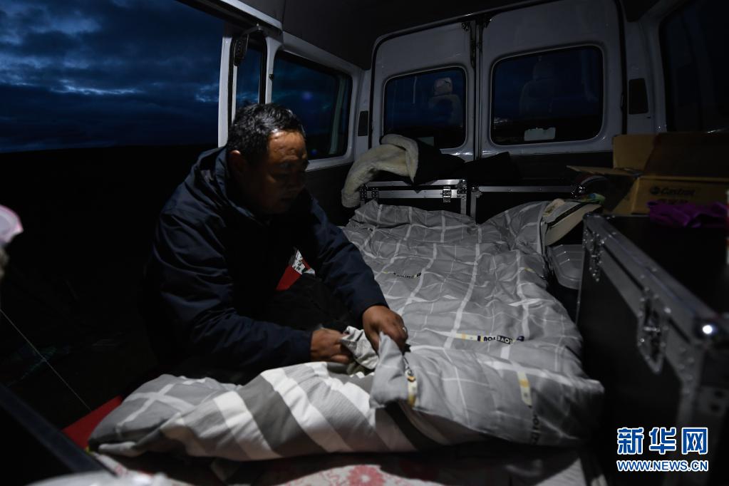 8月3日,在瑪沁縣當洛鄉(xiāng)貢龍村的夏季草場上,南拉才讓在放映車中整理床鋪。每次到草原上放電影,南拉才讓都睡在車里。新華社記者 張龍 攝