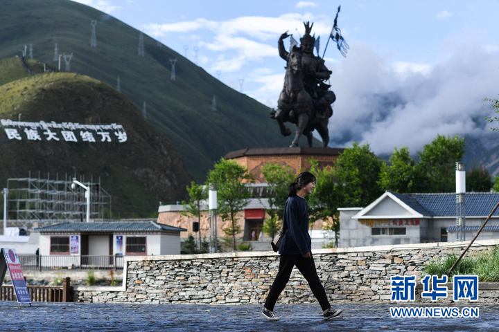 8月6日,市民走過(guò)玉樹(shù)市格薩爾廣場(chǎng)。新華社記者 吳剛 攝