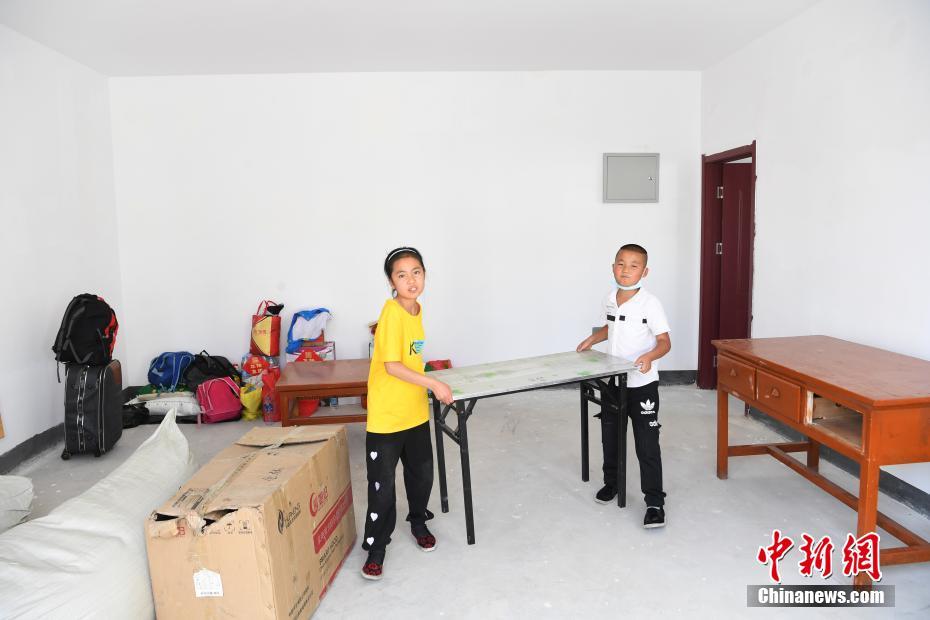 8月7日,甘肅省舟曲縣首批60戶289名地質(zhì)災(zāi)害避險(xiǎn)搬遷村民到達(dá)蘭州新區(qū)并入住,11歲小女孩虎紅霞和弟弟在新家內(nèi)整理家具。甘肅舟曲縣啟動地質(zhì)災(zāi)害避險(xiǎn)搬遷工作,第一批次60戶289人集中告別故土,乘車前往數(shù)百公里之外的蘭州新區(qū)。 中新社記者 楊艷敏 攝