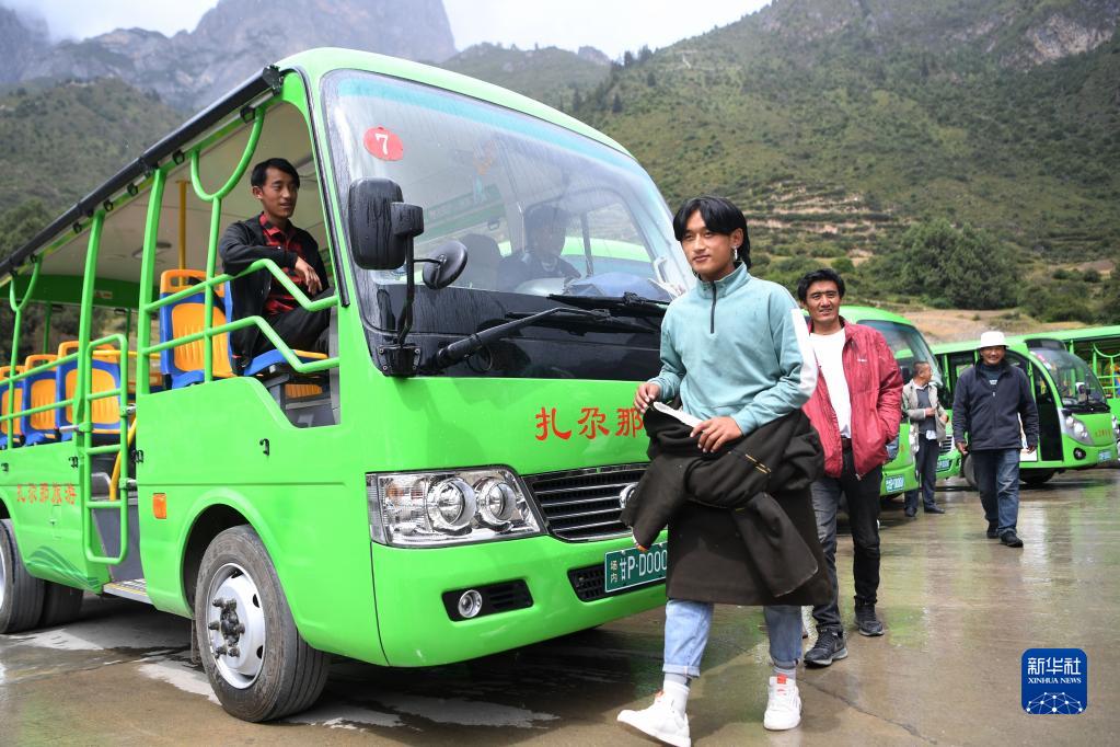 扎尕那村的幾位村民從景區(qū)觀光車??奎c走過(8月28日攝)。新華社記者 陳斌 攝
